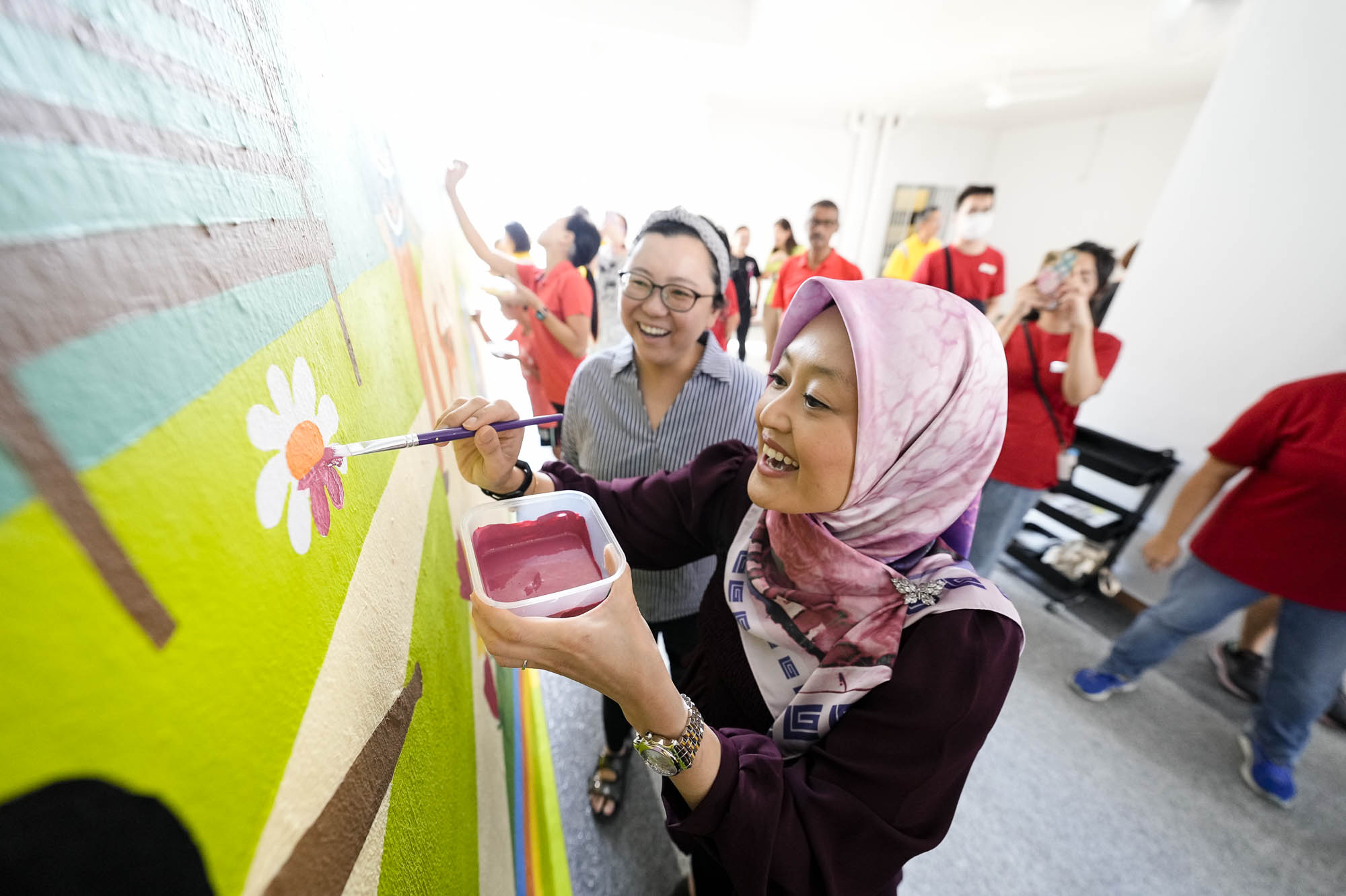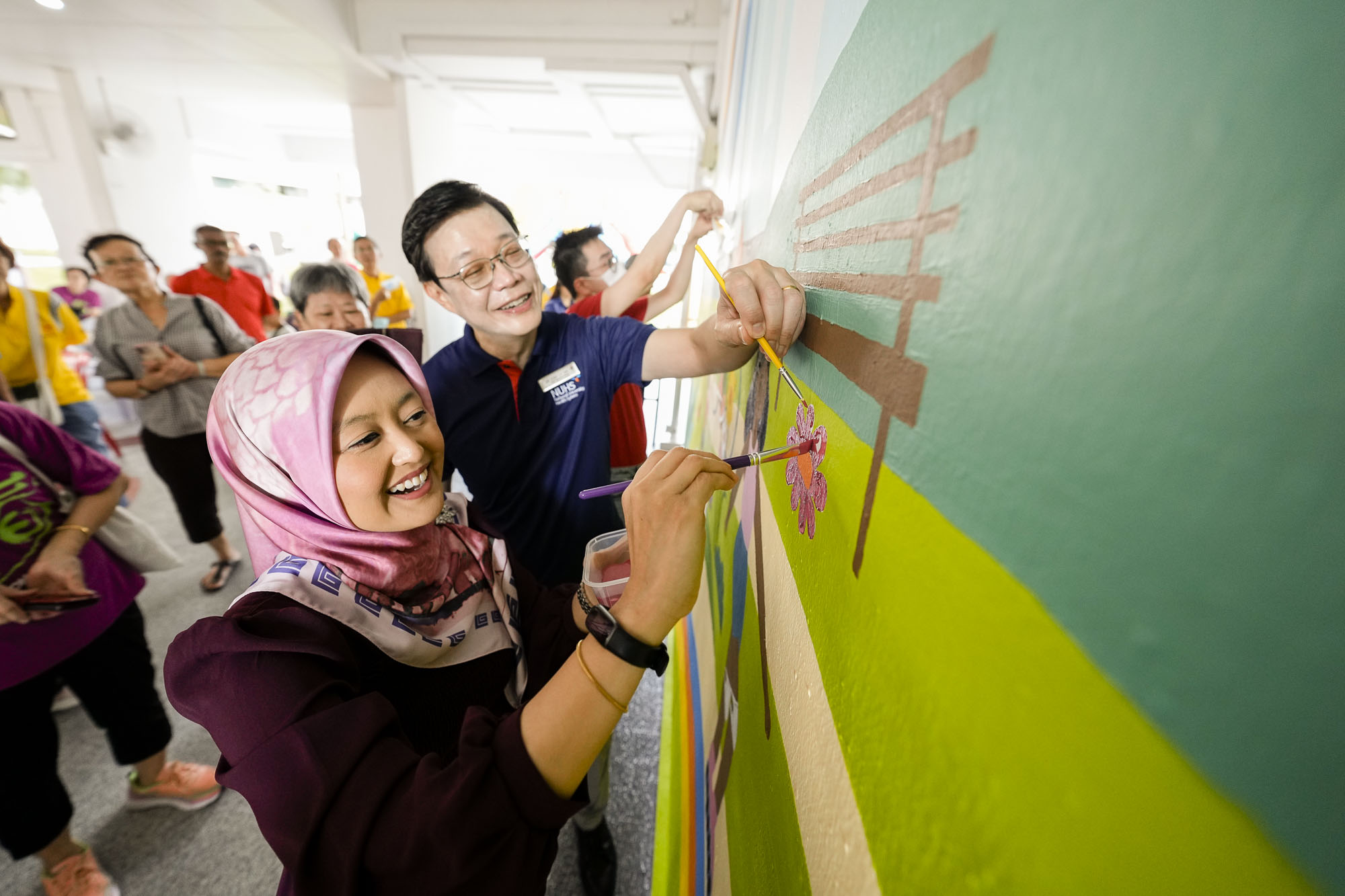 The morning started at Block 205 Jurong East Street 21, where residents gathered to witness the completion of "A Picture of Health @ Jurong East View", a hand-painted wall mural co-created by more than 50 residents of Jurong East View and our staff. The project is a culmination of our efforts to promote health and empower residents of Bukit Batok East to live well in the community. Mdm Rahayu Mahzam, Senior Parliamentary Secretary, Ministry of Health & Ministry of Law, and Grassroots Advisor to Jurong GRC, joined us and added the finishing touches to the mural.