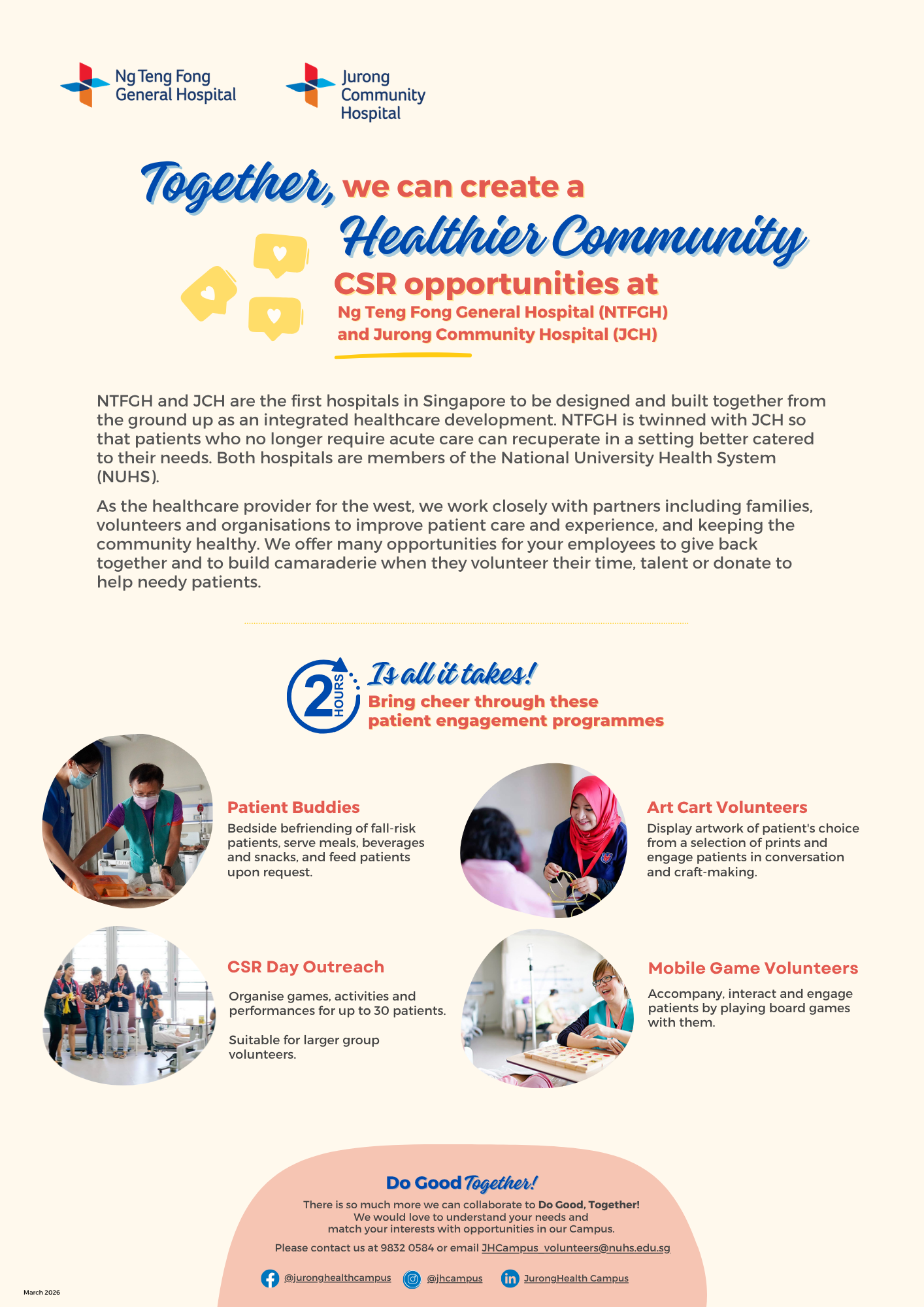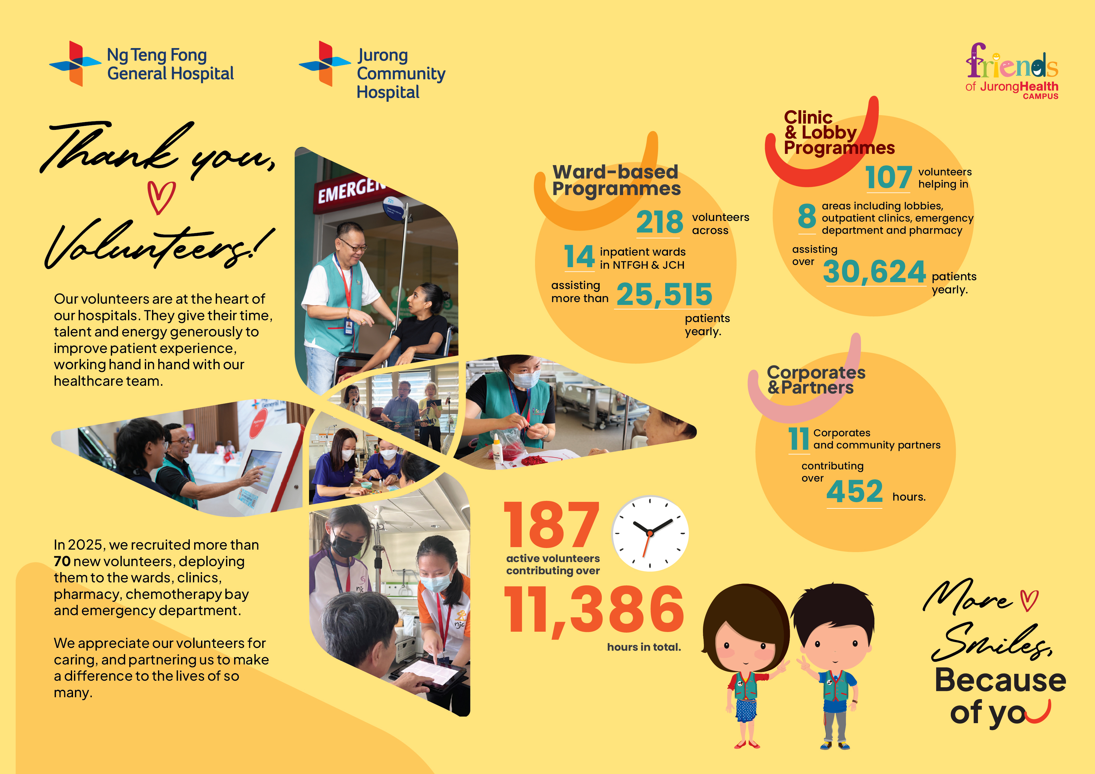 Volunteers play an important role in supporting our healthcare professionals to provide care and improve the experience of our patients and visitors. Volunteers with various skills and interests can contribute your time meaningfully in different programmes and activities.